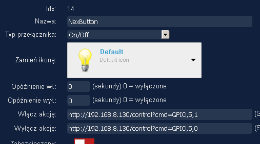 Musimy zadbać o komunikację z Domoticz do ESPEASY. W tym celu przechodzimy do edycji przełącznika i dopisujemy akcję dla włączenia i wyłączenia.