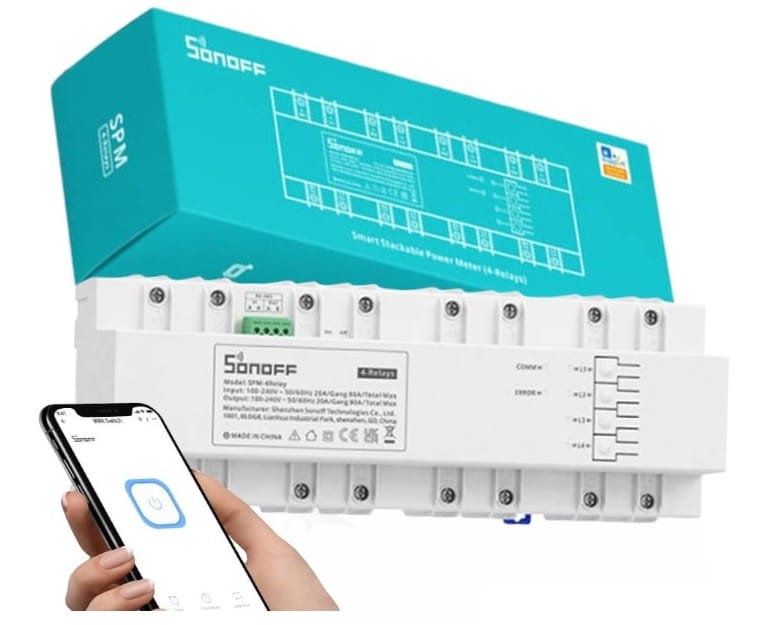 Inteligentní čtyřokruhový přepínač Sonoff SPM-4Relay je čtyřokruhový přepínač schopný měřit proudové parametry pro budování pokročilých systémů založených na RS485. Díky tomuto řešení bude možné plně kontrolovat spotřebu proudu v objektech, jako jsou podniky, hotely, byty atd. Sonoff SPM-4Relay poskytuje inteligentní správu s ochranou proti přetížení, sledováním metadat a statistikami spotřeby elektřiny. Inteligentní měřič spotřeby energie lze namontovat na lištu DIN a lze jej zapojit až do 32 jednotek (32 jednotek SPM-4Relay, každá se 4 relé) do sítě RS485 s jednotkou Sonoff SPM-Main jako síťovým masterem (Pro správnou funkci je zapotřebí SPM-Main - RS485 network master, který je nutné zakoupit samostatně).