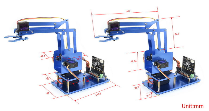 Manipulátor s kovovým ramenem se 4 stupni volnosti, stavebnice pro vlastní montáž kompatibilní s deskami Micro:bit. Sada obsahuje: servoregulátor, 4 serva a sadu kovových dílů, v kombinaci s deskou Micro:bit umožňuje sestavit rameno ovládané přes bluetooth pomocí telefonu.