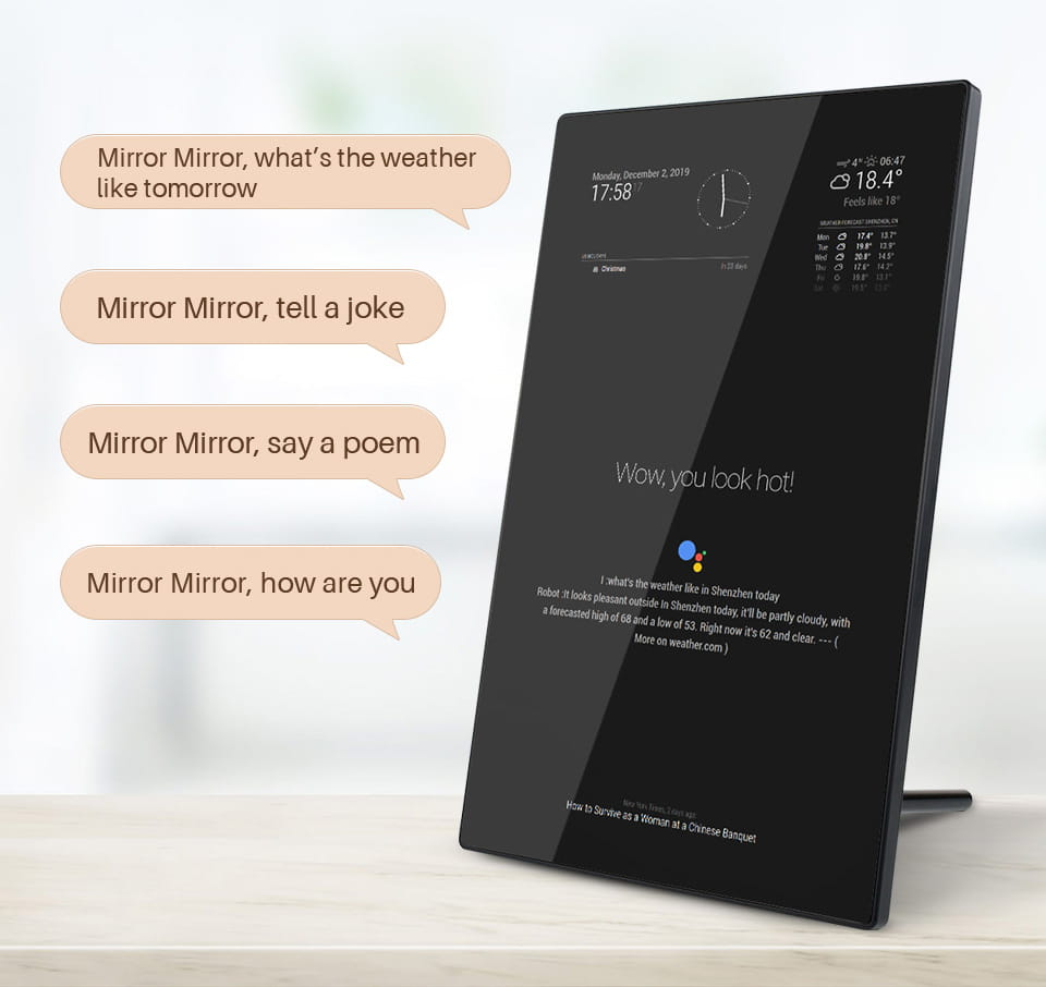 13,3" displej typu magické zrcadlo, který promítá obraz přes odraznou skleněnou desku. Neobvyklý gadget podporující funkci hlasového asistenta, který je ovládán vestavěným počítačem Raspberry Pi 3A+.