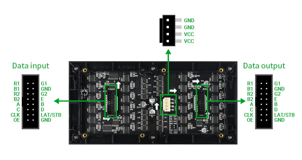 Matrixový panel LED lze řetězit a vytvořit tak větší panel pomocí vstupních/výstupních konektorů HUB75