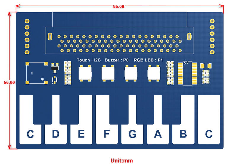 Mini klavírní modul pro micro:bit s dotykovými tlačítky pro sestavení jednoduchého klavíru. Kromě toho je modul vybaven 4 RGB LED diodami WS2812.