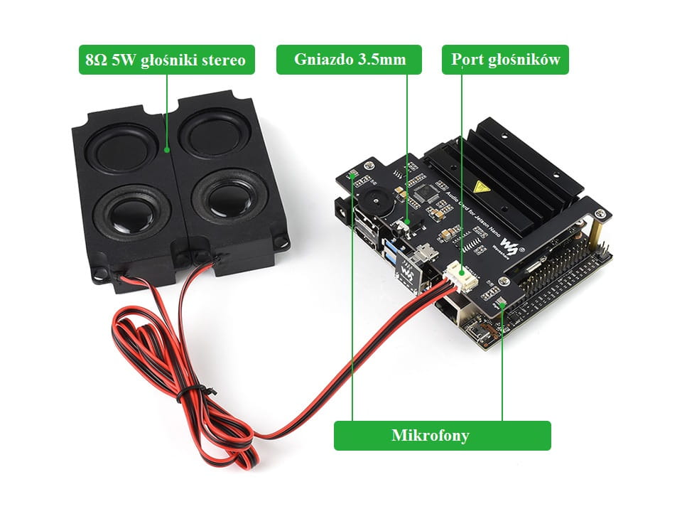 .Jak víme, vývojová sada Jetson Nano nemá žádný zvukový výstup a tento modul byl navržen tak, aby zapadl do skládačky s funkcemi, jako je sběr zvuku, přehrávání hudby, rozpoznávání řeči atd. Zvuková karta USB určená pro minipočítač Nvidia Jetson Nano. Na desce jsou dva mikrofony a konektor pro připojení reproduktorů. Modul nevyžaduje instalaci dalších ovladačů a reproduktory jsou součástí dodávky!