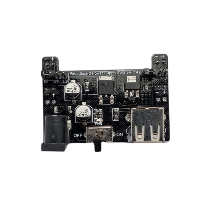 Napájecí modul pro kontaktní desky. Umožňuje připojit ke kontaktní desce napájení 5 V a/nebo 3,3 V pomocí síťového adaptéru. Obvod je vybaven výkonnějším stabilizátorem 5 V, který umožňuje proudy 1 A.