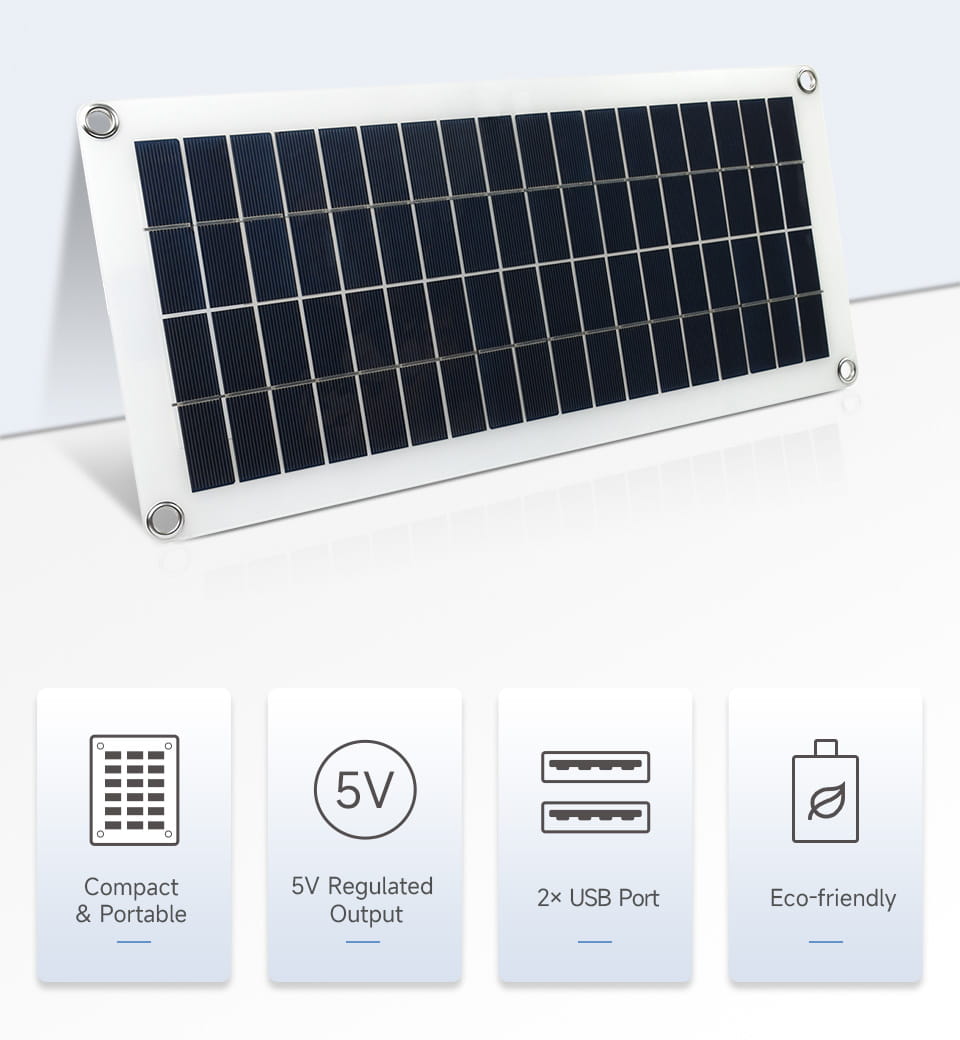 Poloflexibilní solární panel z polykristalického křemíku je mimořádně tenký a přenosný, což ho činí ideální volbou pro ty, kteří chtějí využívat solární energii venku. Panel je vybaven integrovaným obvodem regulátoru napětí 5V a nabízí dva USB výstupy, což umožňuje snadné napájení externích zařízení s napětím 5V. Panel má rezervovaný výstup napájení DC5521 pro připojení k energetickému řídícímu modulu nebo jiným řadičům podporujícím solární panel 18V. Panel je odolný a odolává špatným povětrnostním podmínkám, čímž je skvělou volbou pro ty, kteří chtějí využívat solární energii na různých místech.