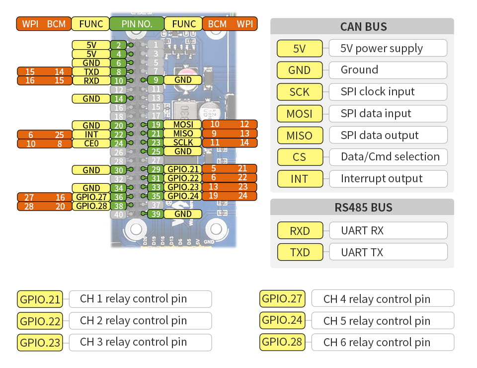 Modul se 6 relé a komunikačními rozhraními RS485 a CAN, který lze celý ovládat pomocí desky Raspberry Pi Zero nebo jiné s kompatibilními vývody GPIO.