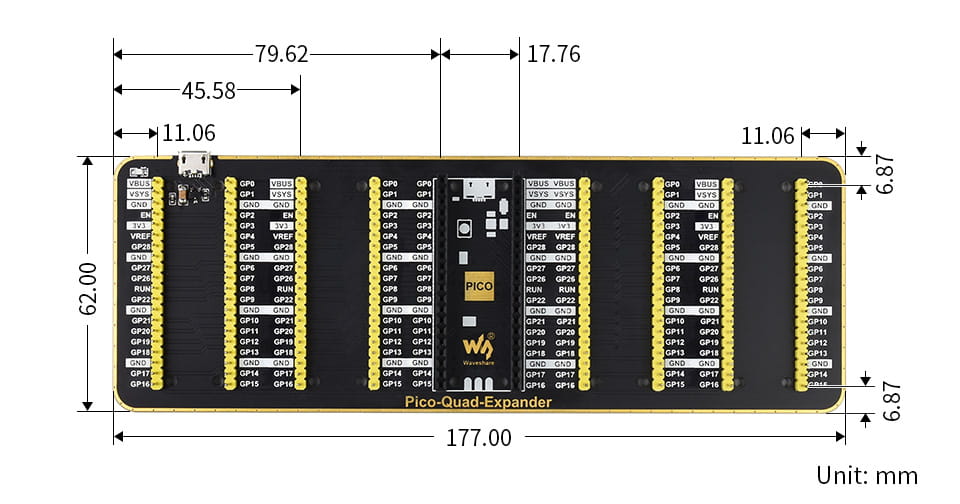 Quad GPIO Expander pro Raspberry Pi Pico, deska se čtyřmi konektory GPIO, která umožňuje připojit k Raspberry Pi Pico další rozšiřující moduly.