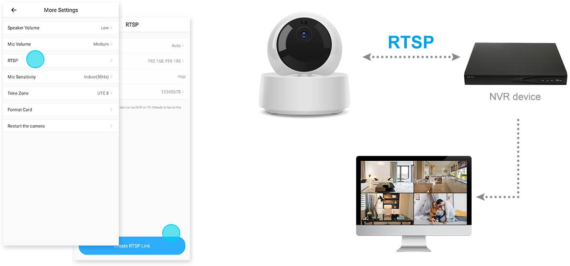 Podpora protokoluRTSP umožňuje připojení kamery k NVR.