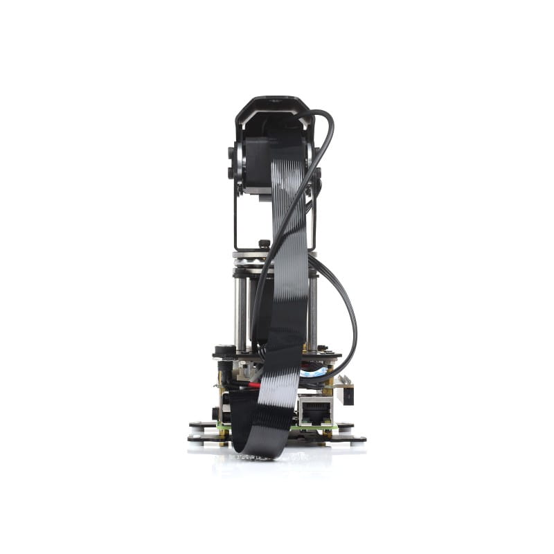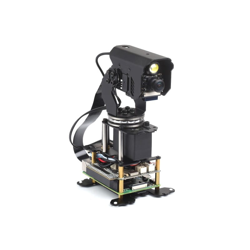 Das Kameramodul mit Zwei-Achsen-Schwenk-Neige-Mechanismus (2-Axis Pan-Tilt Camera Module) verwendet hochmomentige Servomechanismen mit zwei Freiheitsgraden (DOF), die einen breiten Bewegungsbereich sowohl in der horizontalen PAN-Achse (±180°, insgesamt 360°) als auch in der vertikalen TILT-Achse (-45° bis 90°, insgesamt 135°) ermöglichen. Dadurch wird der Abdeckungsbereich der Kamera erheblich erweitert. Das Modul basiert auf einer universellen Robotersteuerplatine und ist kompatibel mit Raspberry Pi 4B/5, was eine erhöhte Hardware-Flexibilität bietet. Benutzer können die Pan- & Tilt-Bewegungen sowie Bildaufnahmefunktionen leicht über ein Open-Source-Webkontrolldemo in Google Chrome steuern. Neben den Grundfunktionen der Fotografie und Videoaufnahme bietet die Kamera auch Gesichts- und Bewegungserkennung, was ein intelligenteres und präziseres Monitoring ermöglicht. Das Modul verwendet hochpräzise Servos mit Direktantrieb sowie 360° 12-Bit-Magnetencoder zur Winkelmessung, was eine genaue Steuerung und Closed-Loop-Kontrolle ermöglicht.