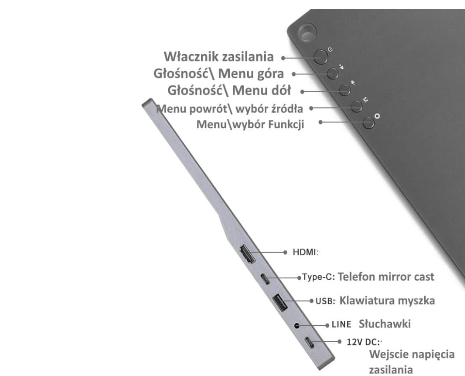 - Monitor posiada wbudowany akumulator 10000mAh umożliwiający do 3-4 godzin pracy