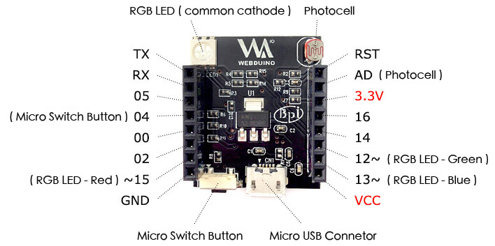 Na pokładzie znajdziemy: fotorezystor, diodę RGB oraz microswitch. Fotorezystor został podłączony do wejścia AD, dioda RGB ze wspólną katodą do wejść: 15,12,13 (R,G,B). Microswitch do wejścia 4.