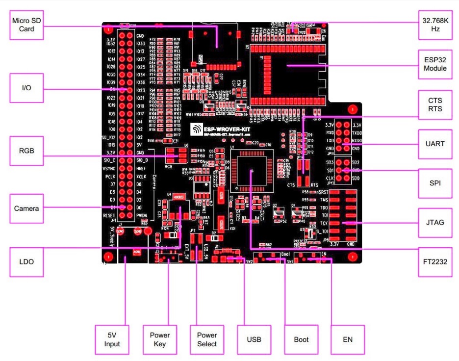 ESP-WROVER-KIT platforma rozwojowa dla układów ESP32, zawierająca wyświetlacz LCD 3.2", gniazdo kart pamięci MicroSD oraz mostek USB na układzie FTDI FT2232HL zapewniający możliwość debugowania układu ESP32. Dodatkowo do modułu można podłączyć kamerę z kontrolerem OV7670.