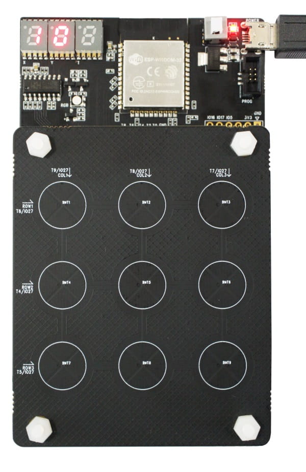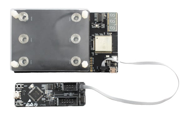 Zestaw ESP32-Sense składa się z płyty głównej i kilku płyt pomocniczych z polami dotykowymi ułożonymi w różnej konfiguracji.Płyta główna poza modułem z ESP32, zawiera wyświetlacz LED, diodę RGB, złącze do podłączenia programatora ESP-Prog, który znajduje się w zestawie.