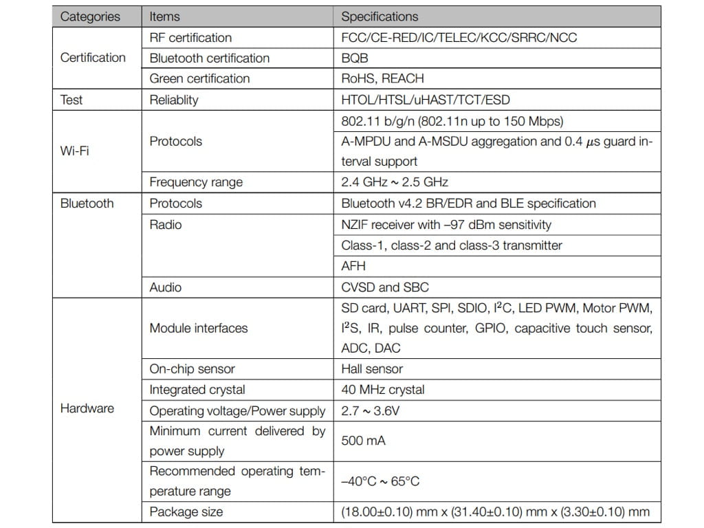 W module został wykorzystany układ ESP32-D0WD (obudowa 5x5mm) zastępujący ESP32-D0WDQ6 (obudowa 6x6mm). ESP32-D0WD posiada dwa niezależnie sterowane rdzenie, zegar sterujący również może być kontrolowany w zakresie od 80 MHz do 240 MHz. Układ posiada wiele wbudowanych peryferii: kontroler czujników dotykowych, czujnik Halla, kontroler Ethernet,SPI, UART, I2S,I2C.