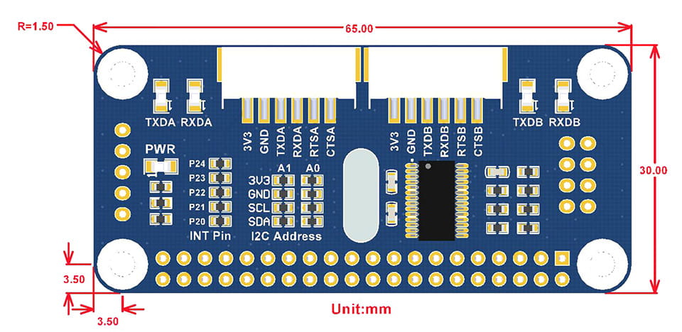 - Zbudowany na układzie SC16IS752, dodaje 2 porty UART i 8 programowalnych GPIO przez I2C,