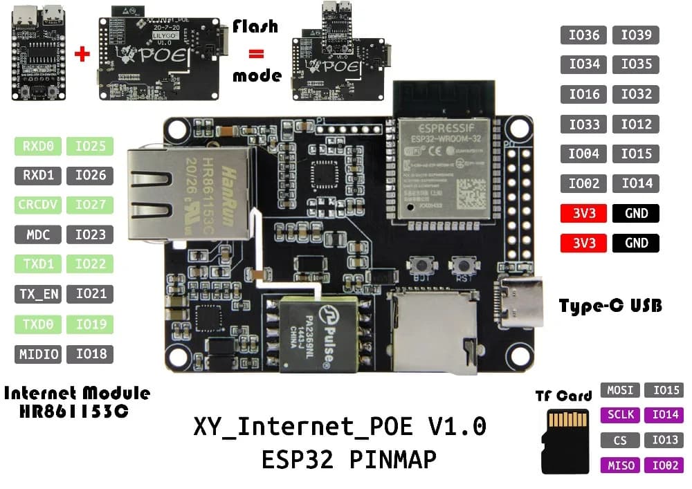 The LILYGO® TTGO t-internet-poe is an advanced development module based on the ESP32-WROOM chip that integrates Ethernet functionality using the LAN8720A chip. With Power over Ethernet (PoE) compatibility in modes A and B, this module offers the flexibility to power devices over a data pair or backup pair, as well as auto MDIX, which enables the use of straight and crossed Ethernet cables.