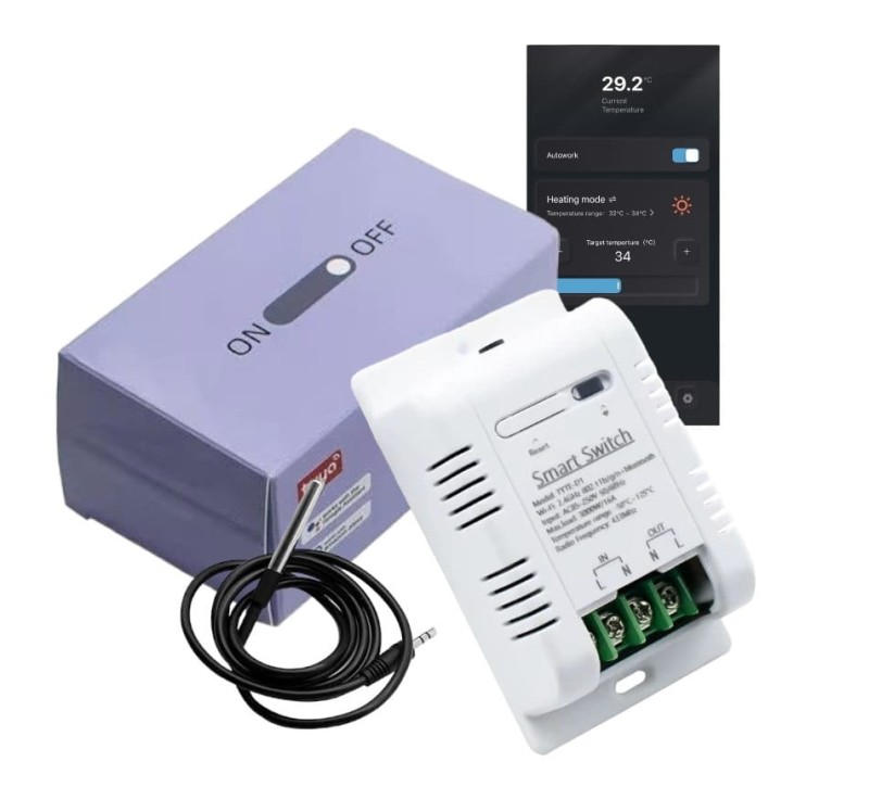 It can act as a thermostat, allowing the relay to be controlled according to the set temperature, thus maintaining the appropriate level of heat in the room. It is controlled via the free Tuya or Smart Life app, and it is also possible to use a radio remote control.