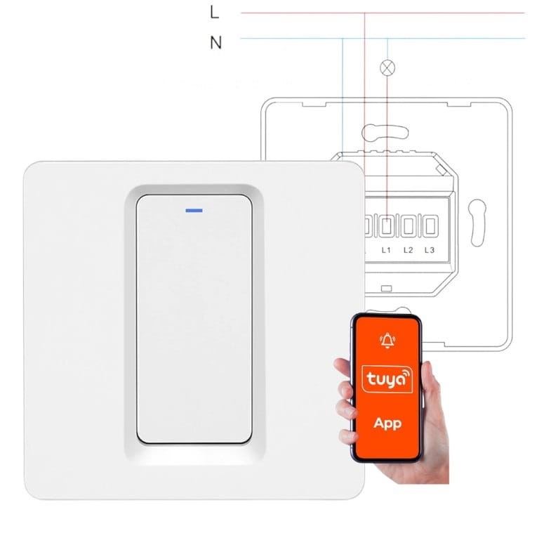 1-obwodowy włącznik światła, umożliwiający zastąpienie tradycyjnego włącznika i sterowanie światłem za pomocą telefonu z dowolnego miejsca na świecie.