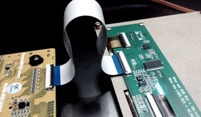 - podłączenie: wyświetlacz łączymy z płytą dołączoną tasiemką, wykorzystując złącze RGB, "niebieskim do góry" jak na foto poniżej