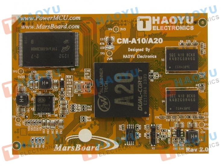 CM-A20 is System on Chip module, which contains Allwinner A20 Dual Core Cortex-A7 processor, Power managment Unit AXP209, Ethernet PHY LAN8710A, 1GB DDR3 memory and 8GB NAND Flash. All Allwinner A20 signals are available on 2 connectors x 100 pin and 1 connector x 40 pin with 1.27mm picth.
