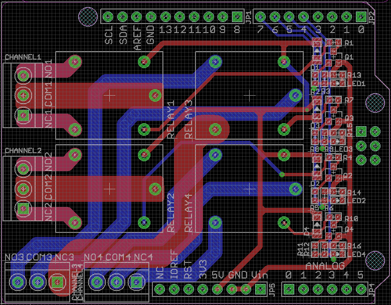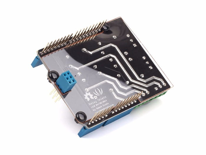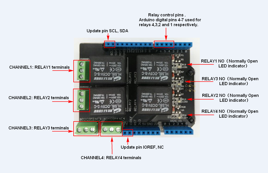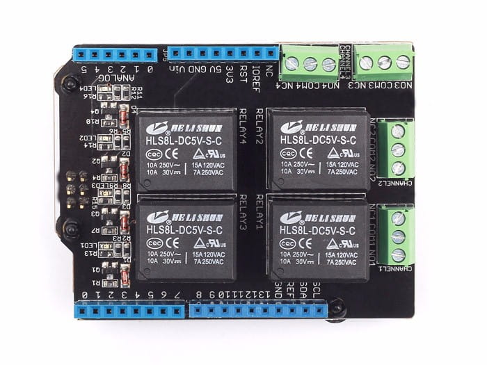 Shield dla Arduino z czterema przekaźnikami, umożliwiającymi sterowanie odbiornikami dużej mocy. Każdy z przekaźników posiada styki NO (normalnie otwiarty) oraz NC (normalnie zwarty).