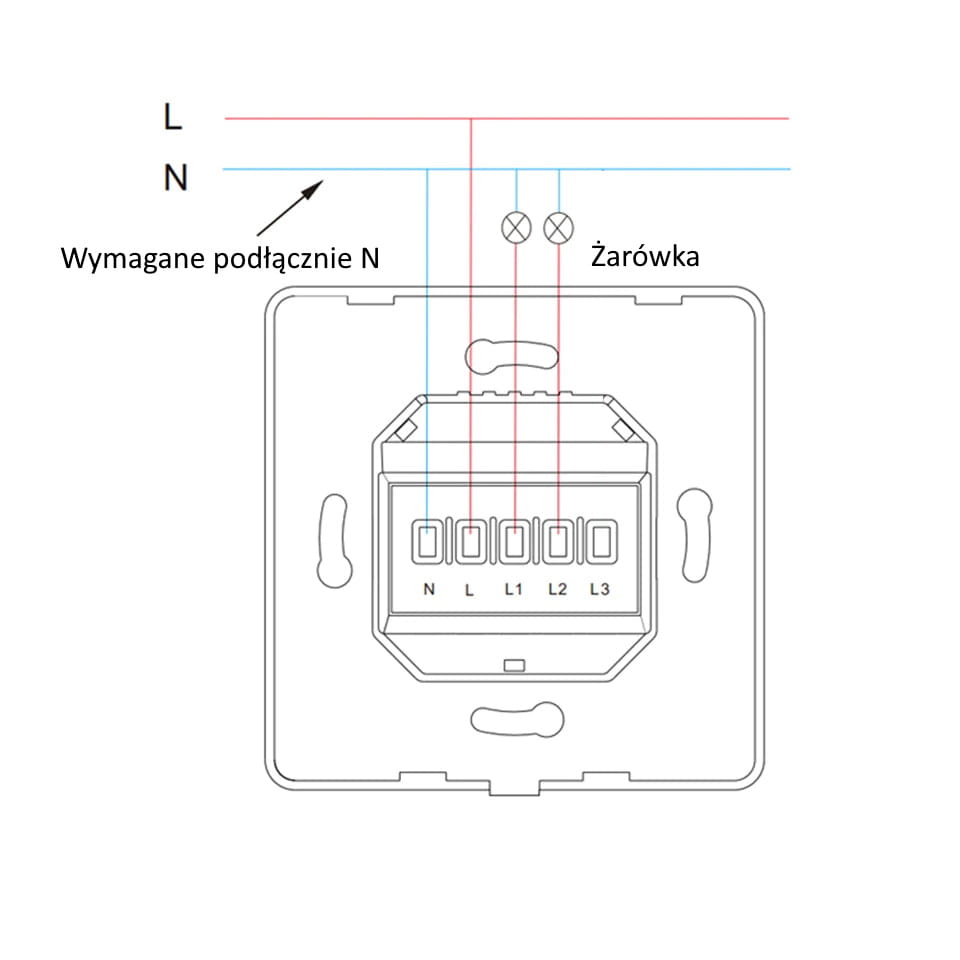Opisywany włącznik światła do działania wymaga podłączenia dwóch linii zasilania L i N. Przed zakupem proszę się upewnić, że wymagane zasilanie jest dostępne w puszce montażowej.
