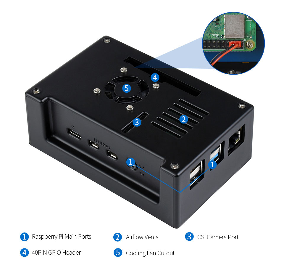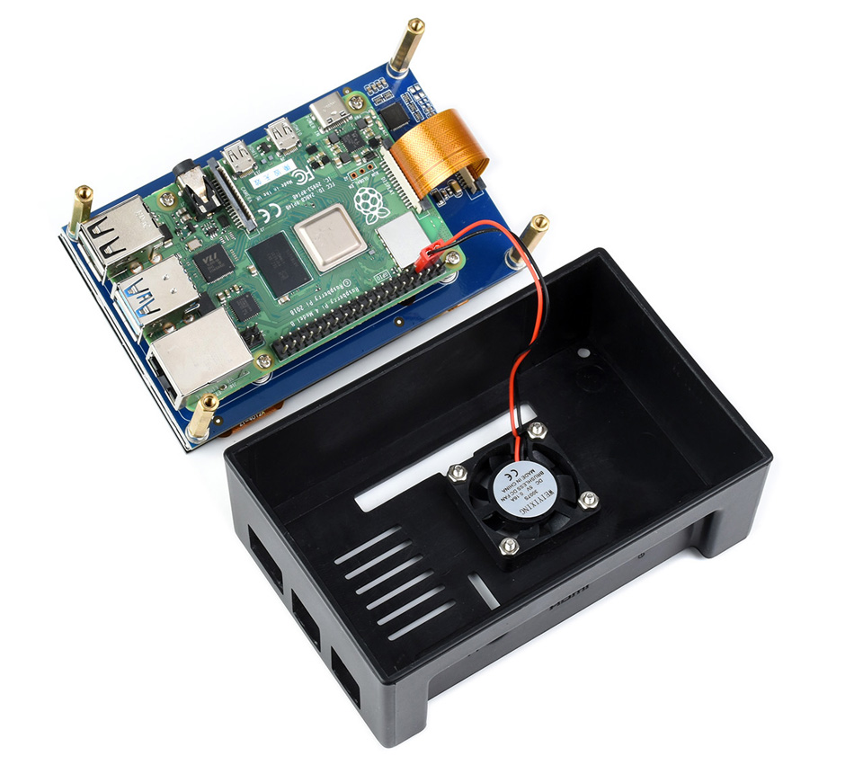W zestawie znajduje się również pasująca do wyświetlacza obudowa wraz z wentylatorem dla Raspberry Pi.